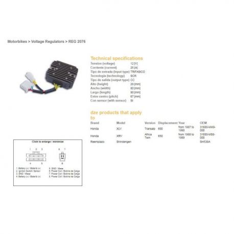 DZE, regulator napětí, Honda XL 600 V 87-90, XRV650 '88-'89 (SH538A), (RGU-144, ESR640), (31600-MM9-000) (31600-MS8-000)