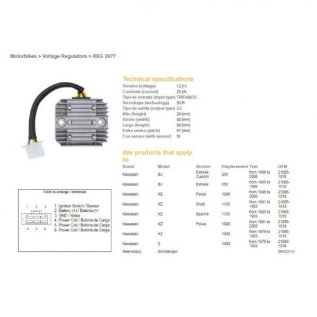 DZE, regulator napětí, Kawasaki GPZ/KZ/Z 750/1000/1100 (SH532-12,ESR140)