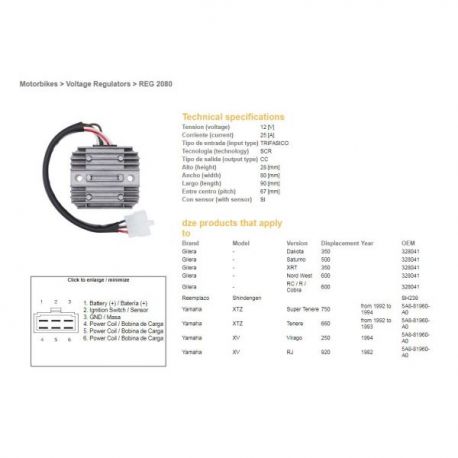 DZE, regulator napětí, Yamaha XTZ660 '92-'93, XTZ750 '93-'94, SR500 '78-'82 (2J2-81960-A0, 2J2-81960-A1)