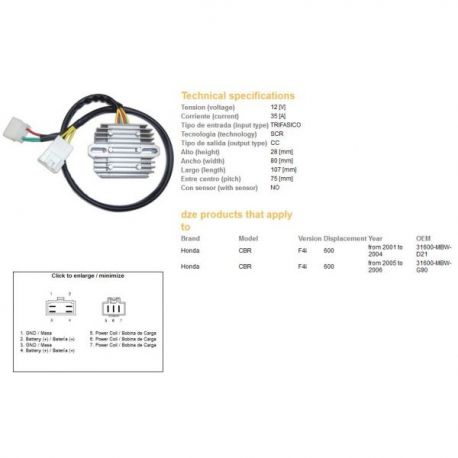 DZE, regulator napětí, Honda CBR 600F 4 I '01-'06 (35A) (31600-MBW-D21) (ESR431) (SH678PA)