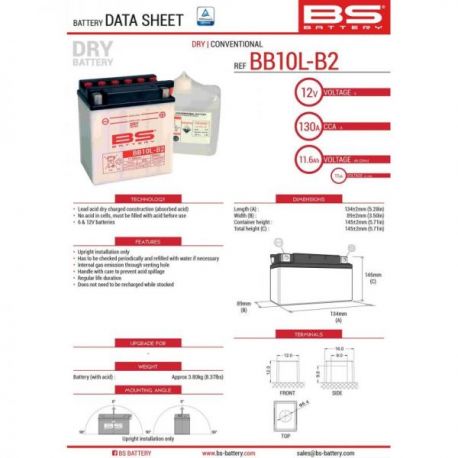 BS, akumulátor BB10L-B2 (YB10L-B2) 12V 11AH 134X89X145, olověný (130A) (4) UE2019/1148