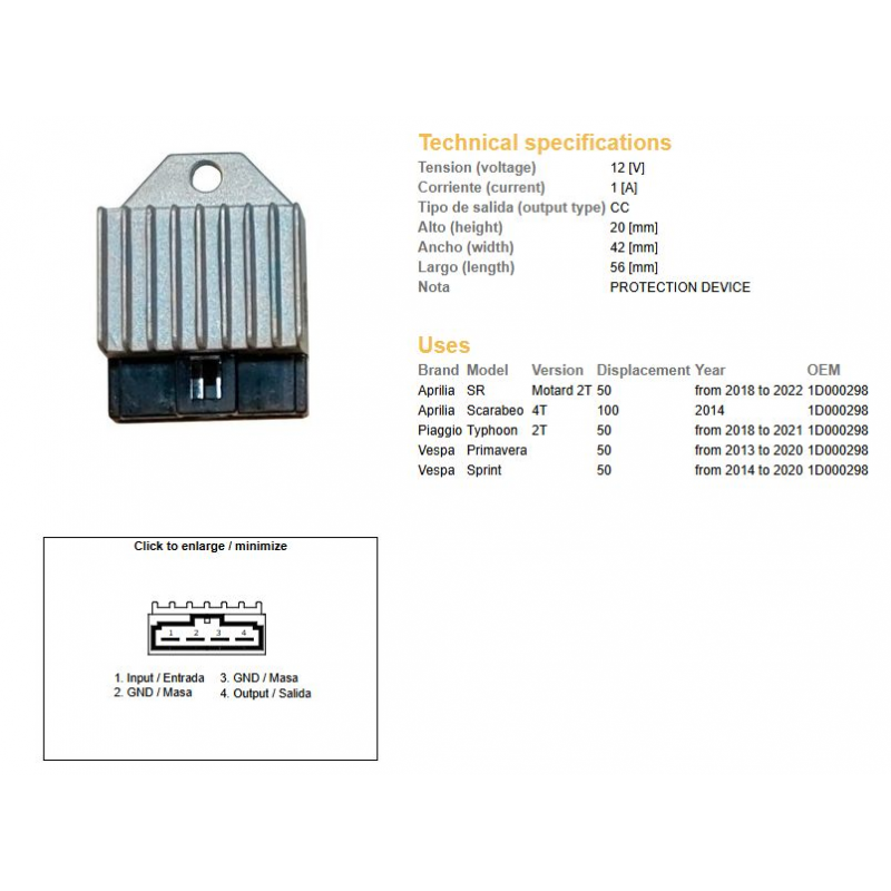 DZE, regulátor napětí, Aprilia SR 50 '18-'22 50 TYPHON '13-'20 100 TYPHON '14- VESPA