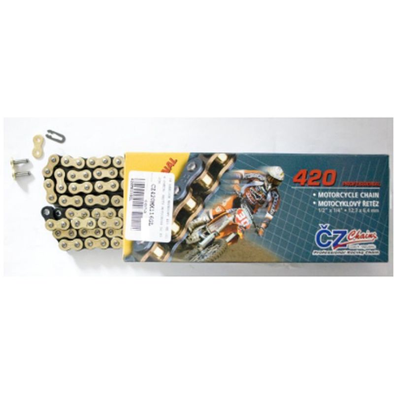ČZ, řetěz 420 MX (118 článků) zlatý (motocross do 85 ccm) (22,0 KN) + spojka