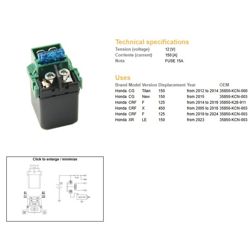 DZE, startovací relé, Honda CG 150 '12-'14 CRF 125 '14-'24 CRF 450X '05-'18 (OEM 35850-KCN-003)